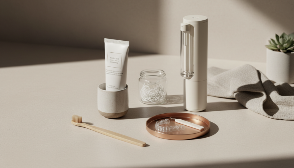 外したマウスピースは、衛生面を考慮して専用ケースに入れて保管しましょう。食事が終わったら、可能であれば歯を磨いてから再装着します。歯磨きが難しい状況では、マウスウォッシュやフロスで口腔内を清潔に保つことも有効です。