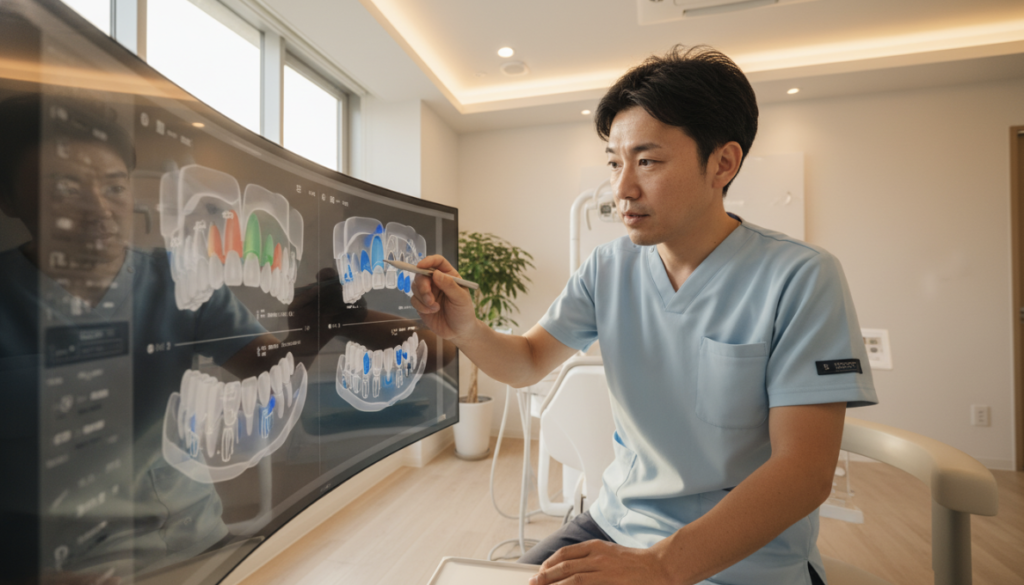 インビザラインによる過蓋咬合治療では、まず口腔内スキャナーで歯列を3Dデータ化し、歯列弓の形・顎骨の幅・歯軸の傾きまでAIで分析します。必要なスペース量を0.1mm単位で設計し、「抜かずに治せる過蓋咬合」と「抜歯が必要な過蓋咬合」を明確に区別します。